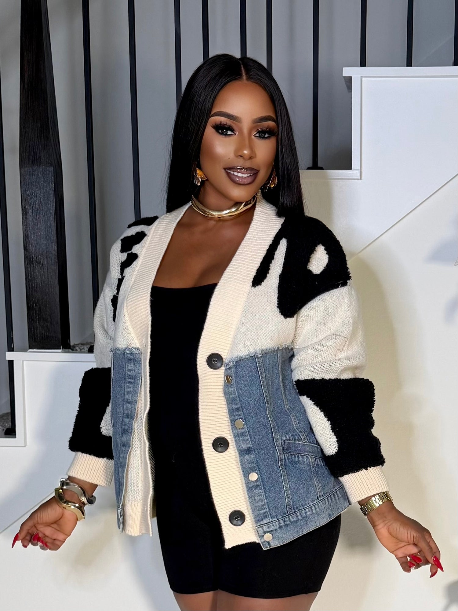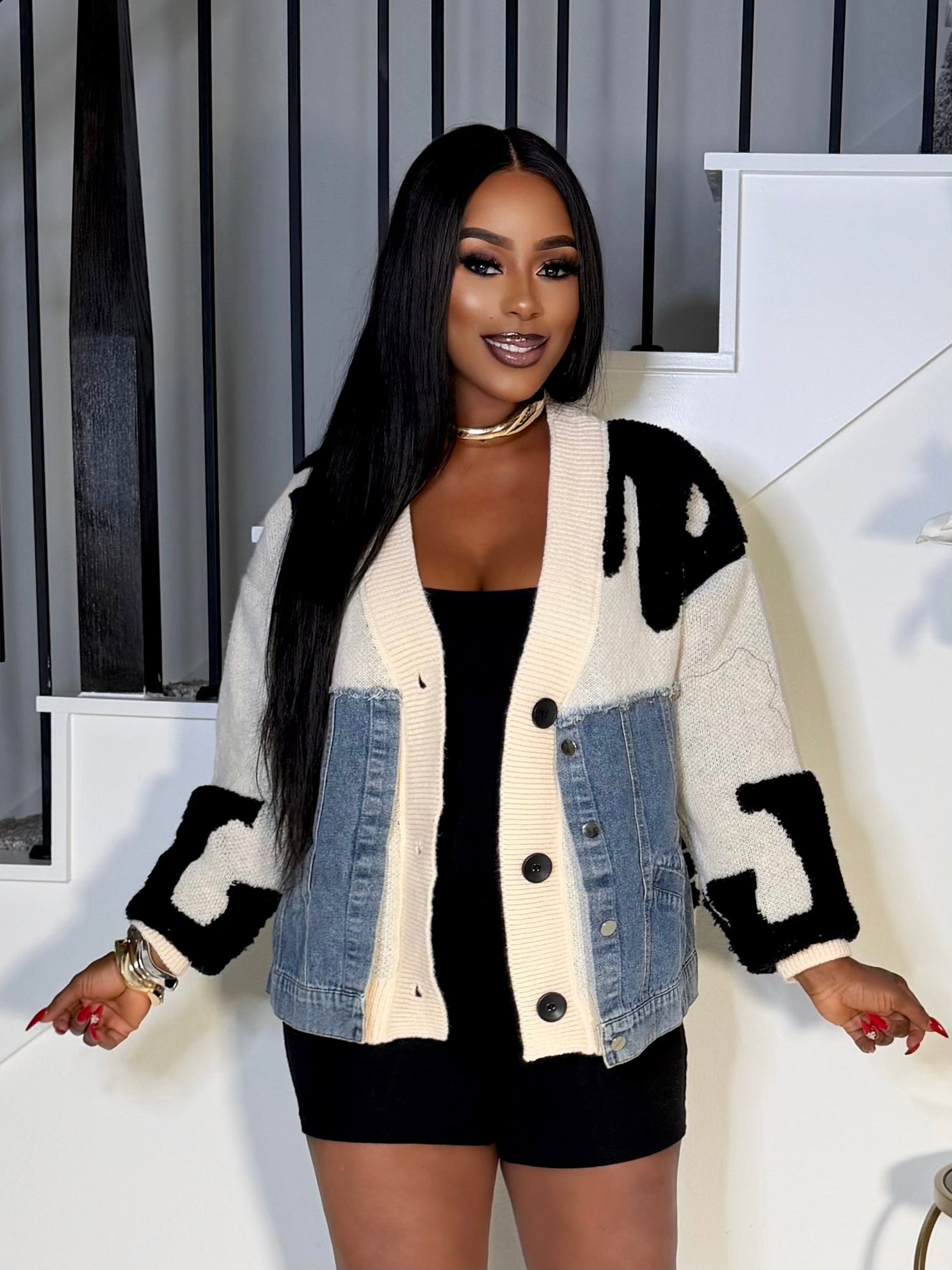 OVERSIZED FASHION KNIT AND DENIM JACKET (BEIGE)